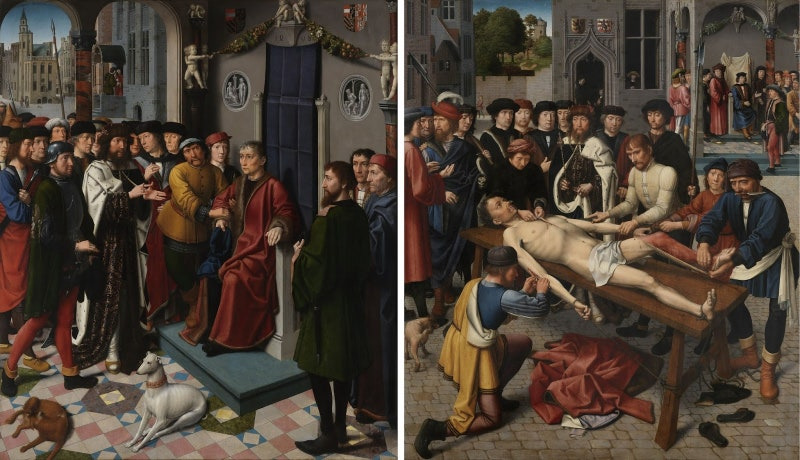작품의 왼쪽 패널에서는 판사가 왕좌에 앉아 판결을 내리는 장면이 그려져 있습니다. 이 장면은 권위와 정의의 상징으로 해석될 수 있습니다. 반면 오른쪽 패널에서는 처벌을 받는 인물이 등장하며, 이는 부정의 대가를 상징적으로 나타냅니다. 이러한 대조는 관객에게 강한 인상을 남깁니다.